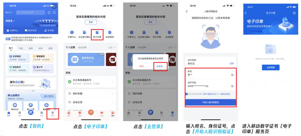 1.經(jīng)辦人須刷臉登錄粵商通APP,在【我的】-【電子印章】中將數(shù)字證書安裝好,并生成包括個(gè)人章在內(nèi)的三個(gè)印章;
