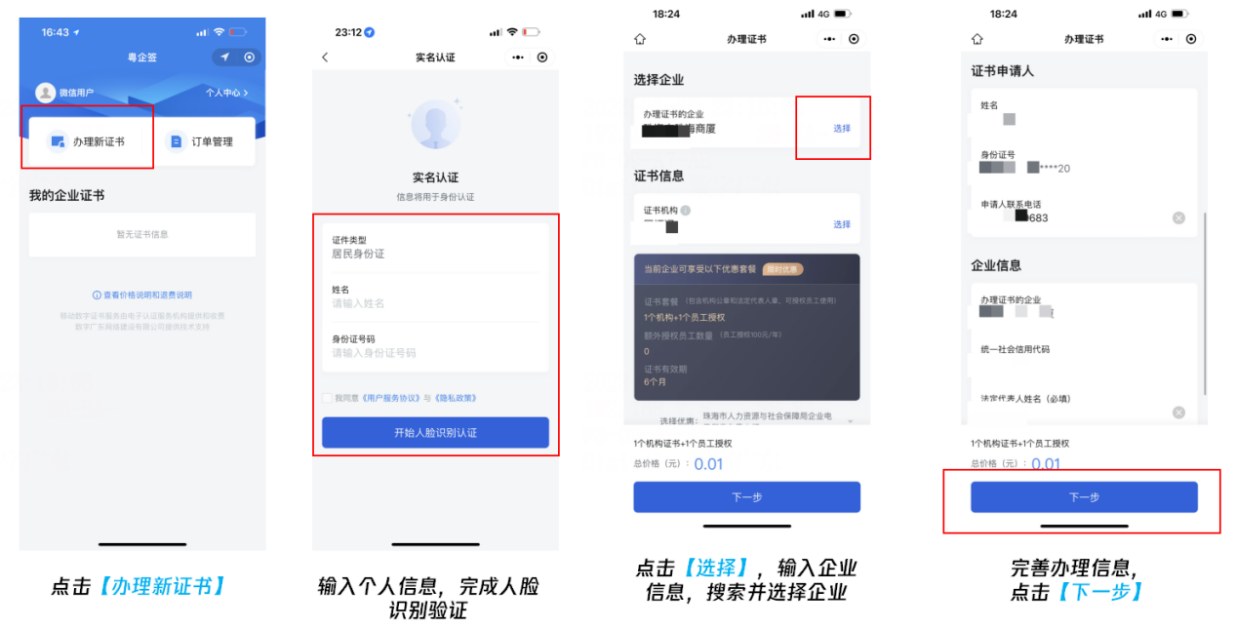 在粵企簽小程序辦理證書(印章),辦理人可通過“法定代表人人臉識(shí)別驗(yàn)證”或“對(duì)公銀行賬號(hào)轉(zhuǎn)賬驗(yàn)證”完成企業(yè)認(rèn)證。