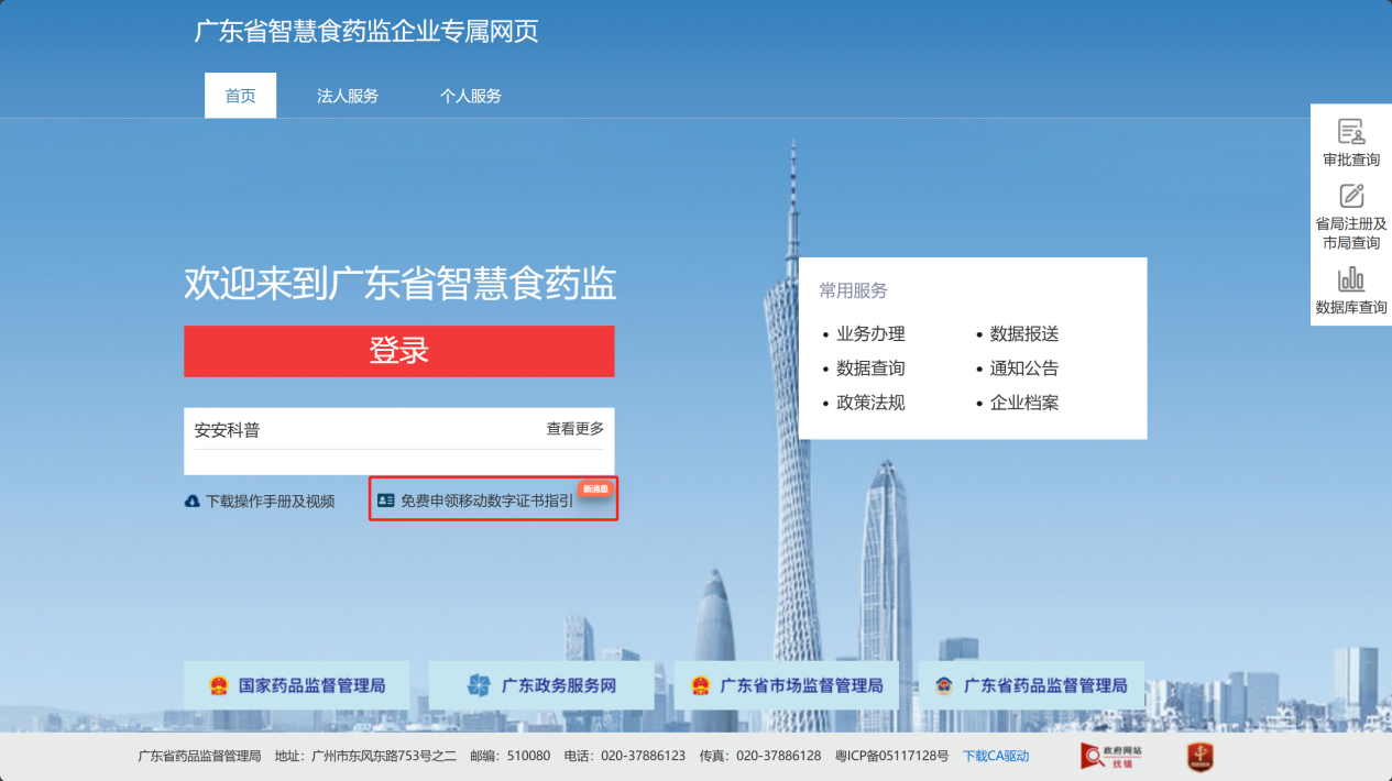 輸入登錄地址訪問企業(yè)專屬網(wǎng)頁,點(diǎn)擊登錄按鈕右下方“免費(fèi)申領(lǐng)移動(dòng)數(shù)字證書指引”跳轉(zhuǎn)至廣東省藥品監(jiān)督管理局官網(wǎng)查看操作指引,并下載安裝移動(dòng)數(shù)字證書。