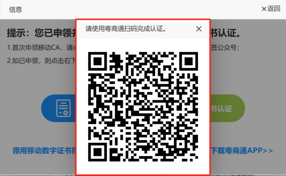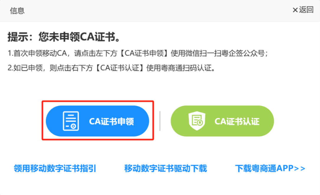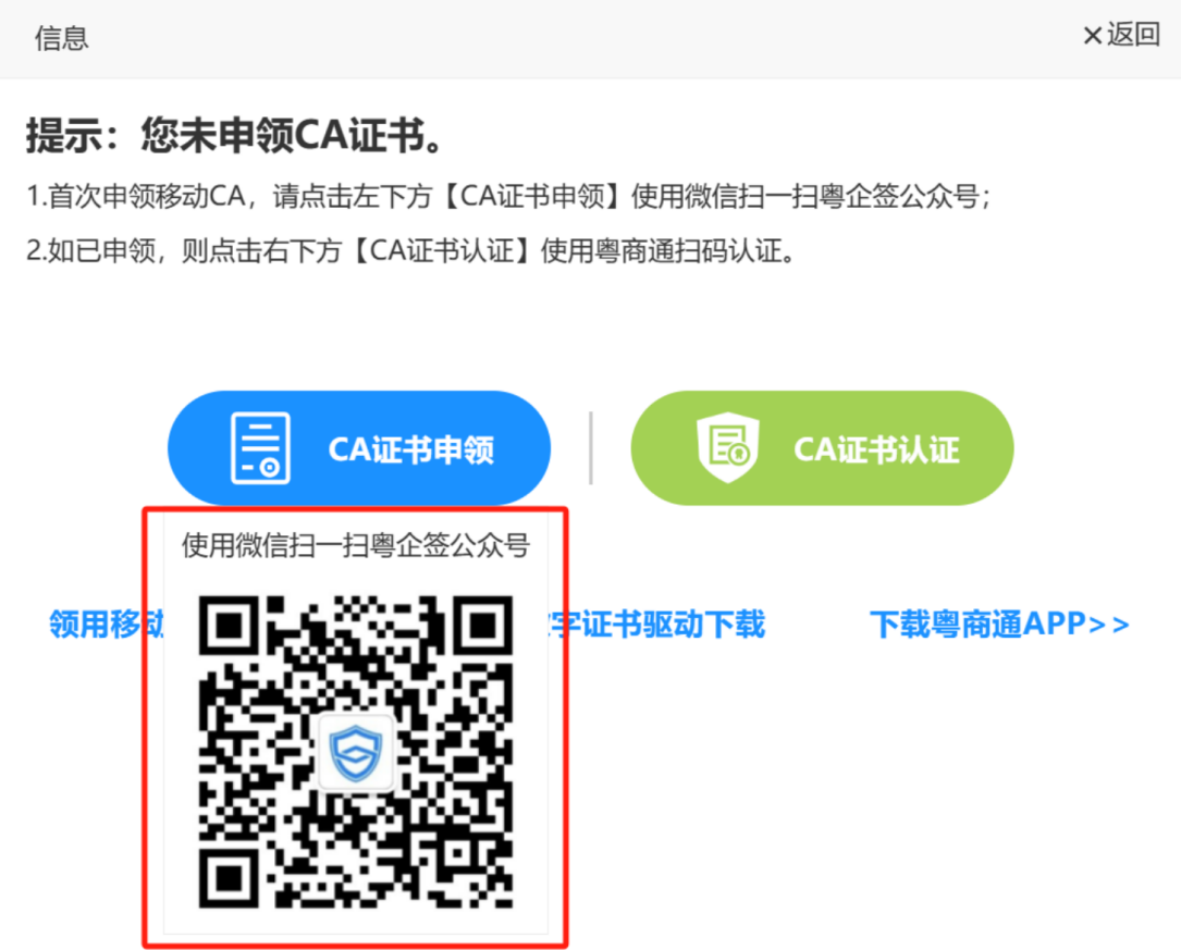 如已申領(lǐng),則點(diǎn)擊右下方【CA證書認(rèn)證】使用粵商通掃碼認(rèn)證。