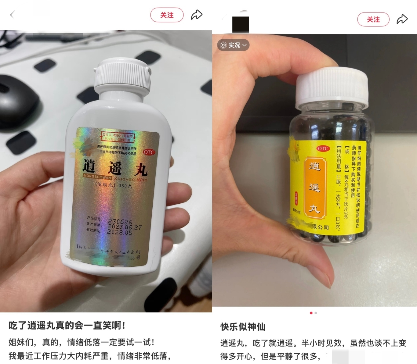 在一些社交平臺上,有些網(wǎng)友發(fā)帖稱吃了逍遙丸能夠舒緩焦慮、平復(fù)心情,可以專治各種“不開心”,甚至還有網(wǎng)友表示吃完的第二天抑郁情緒緩解了不少。
