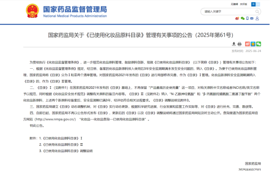 日前,根據(jù)《國家藥監(jiān)局關(guān)于〈已使用化妝品原料目錄〉管理有關(guān)事項(xiàng)的公告》,國家藥監(jiān)局建立《目錄》動態(tài)調(diào)整機(jī)制,并將《目錄》分為Ⅰ和Ⅱ兩個清單管理,自即日起對《目錄》實(shí)行動態(tài)更新。