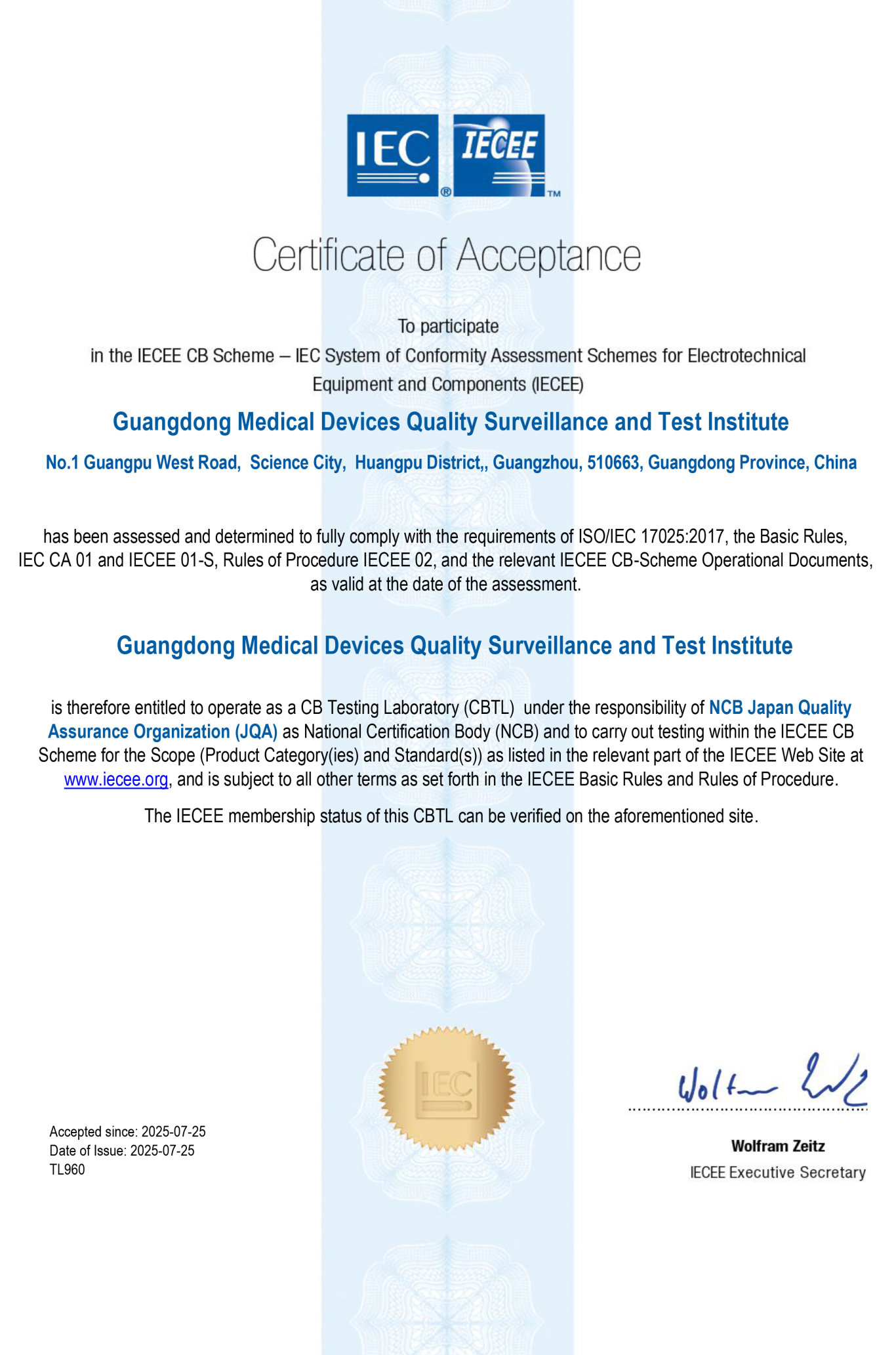 近日,廣東省醫療器械質量監督檢驗所成功取得國際電工委員會電工產品及零部件測試證書互認體系(IECEE CB體系)檢測實驗室資質證書,資質涵蓋電磁兼容和醫用電氣設備領域12項IEC標準。這標志著廣東省醫療器械質量監督檢驗所質量管理體系和相關檢驗能力獲得國際認可,成為國內首個獲得CB檢測實驗室資質的省級醫療器械檢驗機構,將為本地醫療器械企業產品出口提供相應檢測服務。