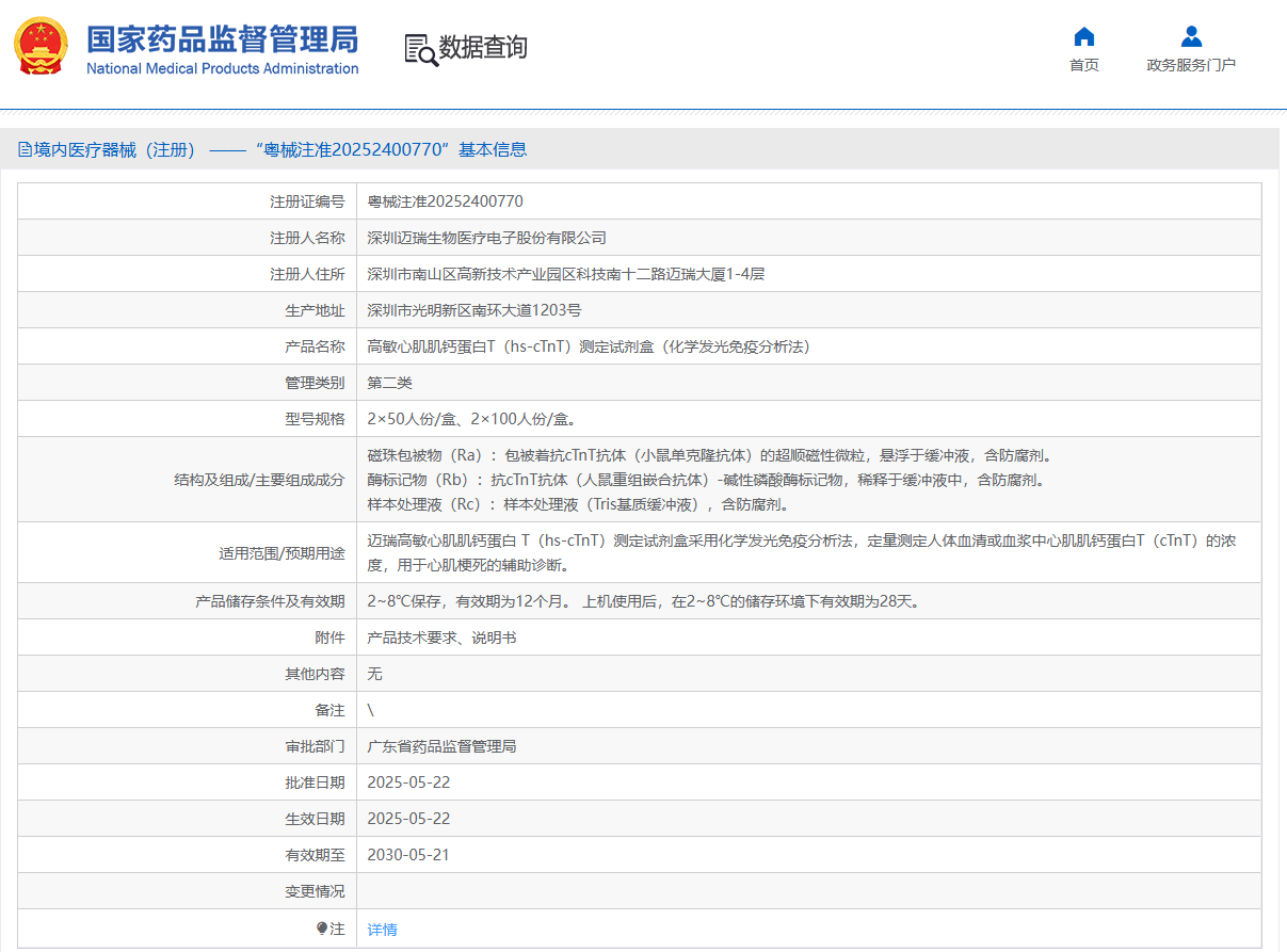 ▲圖為“高敏心肌肌鈣蛋白T(hs-cTnT)測定試劑盒(化學發光免疫分析法)”獲批信息