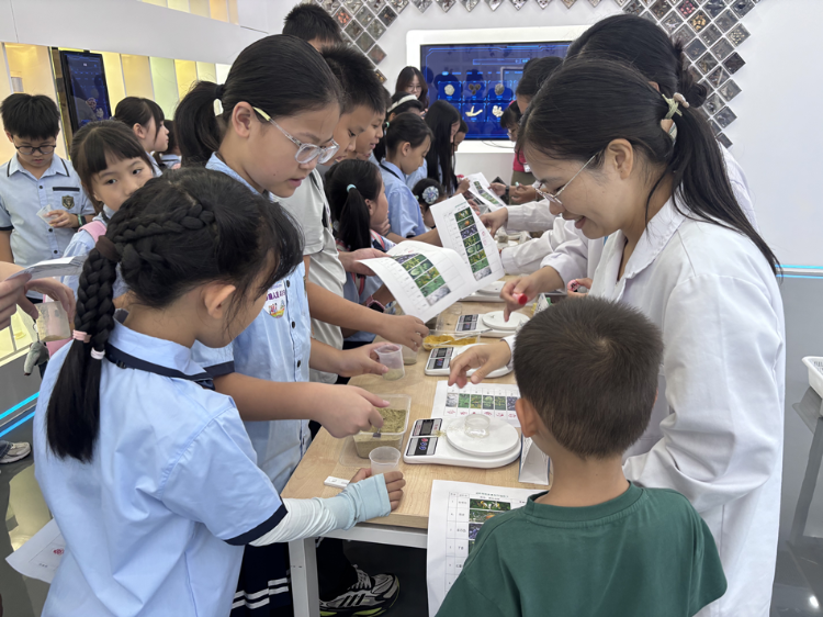 小記者們興致勃勃地來(lái)到了中藥數(shù)字化標(biāo)本館及智慧苗圃。他們?cè)诰薮蟮闹兴幉臉?biāo)本墻前停住了腳步,一罐罐中草藥標(biāo)本栩栩如生,千年百草與現(xiàn)代科技交融輝映,仿佛在講述中醫(yī)藥文化從涓涓細(xì)流到江河匯流的發(fā)展歷程。工作人員耐心講解了廣陳皮、化橘紅、廣藿香等嶺南道地藥材的“前世今生”,帶領(lǐng)孩子們開(kāi)啟了一場(chǎng)跨越時(shí)空的中醫(yī)藥文化之旅。