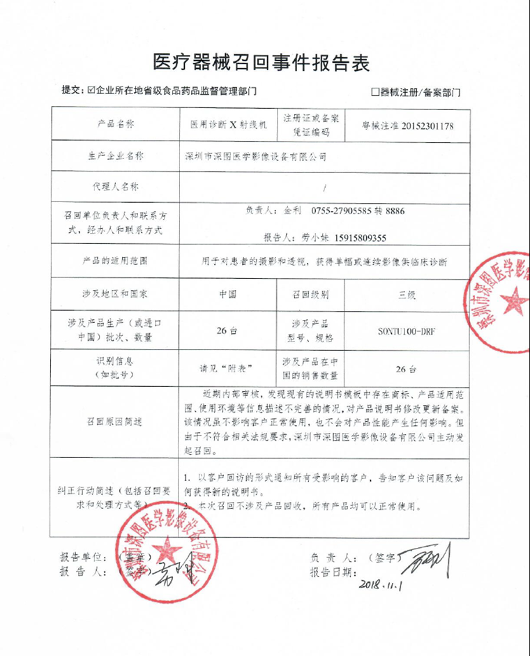 深圳市深圖醫學影像設備有限公司報告,該公司生產的醫用診斷X射線機由于說明書模版存在信息描述不完善,對產品說明書進行更新備案的原因,深圳市深圖醫學影像設備有限公司主動召回有關產品,召回級別為三級。涉及產品的型號及批次等詳細信息見《醫療器械召回事件報告表》。