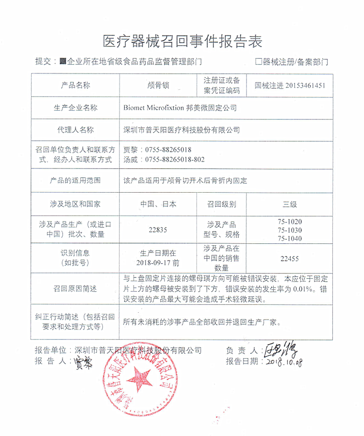 深圳市普天陽醫療科技股份有限公司報告,由于產品組件可能錯誤組裝等原因, 邦美微固定公司Biomet Microfixation對其生產的顱骨鎖(注冊證號:國械注進20153461451)主動召回。召回級別為三級。涉及產品的型號、規格及批次等詳細信息見《醫療器械召回事件報告表》。