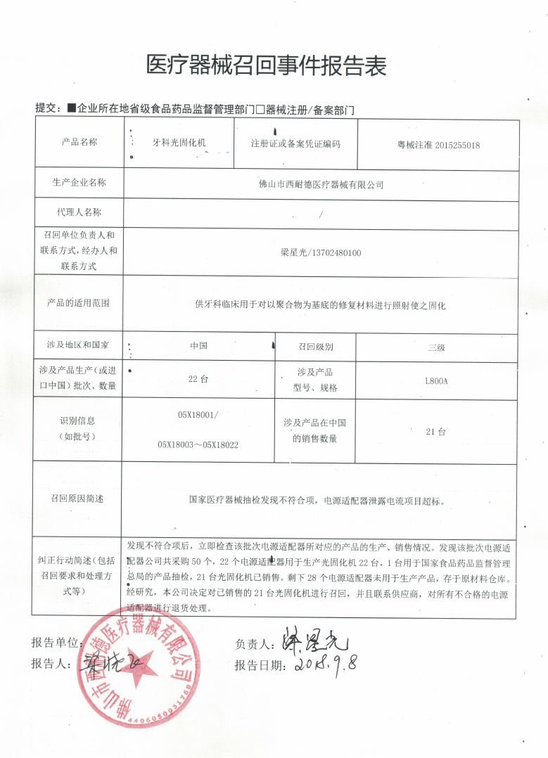 佛山市西耐德醫療器械有限公司報告,該公司生產的牙科光固化機經檢驗,不符合標準規定。佛山市西耐德醫療器械有限公司主動召回有關產品,召回級別為三級。涉及產品的型號、規格及批次等詳細信息見《醫療器械召回事件報告表》。