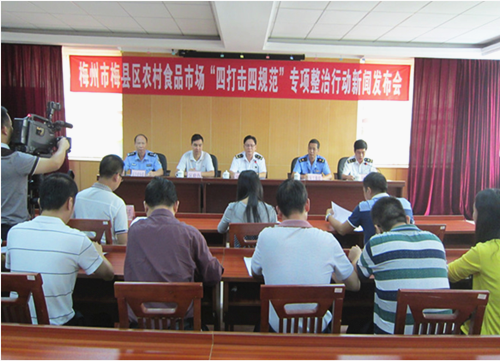 梅州市梅縣區局把民主評議政風行風工作與開展農村食品市場“四打擊四規范”專項整治行動緊密結合,近日,召開了開展農村食品市場“四打擊四規范”專項整治情況新聞發布會。區食安辦、區局主要負責同志對梅縣區開展農村食品市場“四打擊四規范”專項整治行動的進展情況進行了通報,全區出動執法人員960多人次,檢查相關企業780多家次,現場發出責令整改通知書7份,立案7宗,受理和處理消費者投訴舉報6件,發送手機宣傳信息4000多條,發放宣傳資料500多份。期間,區食藥監局聯合市食藥監局和區公安分局,依法查處了使用非食用二氧化碳制售啤酒案件。同時對下一步工作進行部署:加大執法力度,嚴厲打擊制售假冒偽劣食品違法犯罪行為,規范食品生產經營者生產經營行為,積極建立和完善農村食品市場長效監管機制,不斷改善農村地區食品安全狀況,努力開創梅縣區農村食品安全工作新局面。(梅州市梅縣區局供稿/圖)