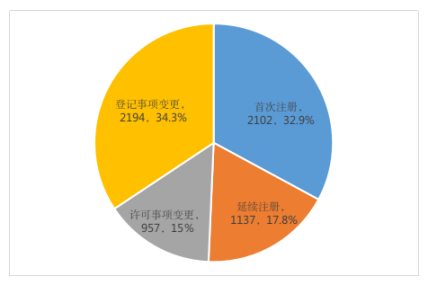 按注冊(cè)形式區(qū)分,首次注冊(cè)申請(qǐng)2102項(xiàng),占全部第二類醫(yī)療器械注冊(cè)申請(qǐng)的32.9%;延續(xù)注冊(cè)申請(qǐng)1137項(xiàng),占全部第二類醫(yī)療器械注冊(cè)申請(qǐng)的17.8%;許可事項(xiàng)變更注冊(cè)申請(qǐng)957項(xiàng),占全部第二類醫(yī)療器械注冊(cè)申請(qǐng)的15.0%;登記事項(xiàng)變更注冊(cè)申請(qǐng)2194項(xiàng),占全部第二類醫(yī)療器械注冊(cè)申請(qǐng)的34.3%(受理情況及注冊(cè)形式分布比例分別見圖1、圖2)。