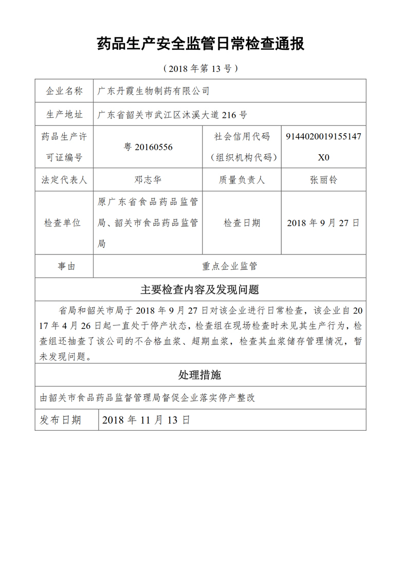 藥品生產(chǎn)安全監(jiān)管日常檢查通報(2018年第13號)